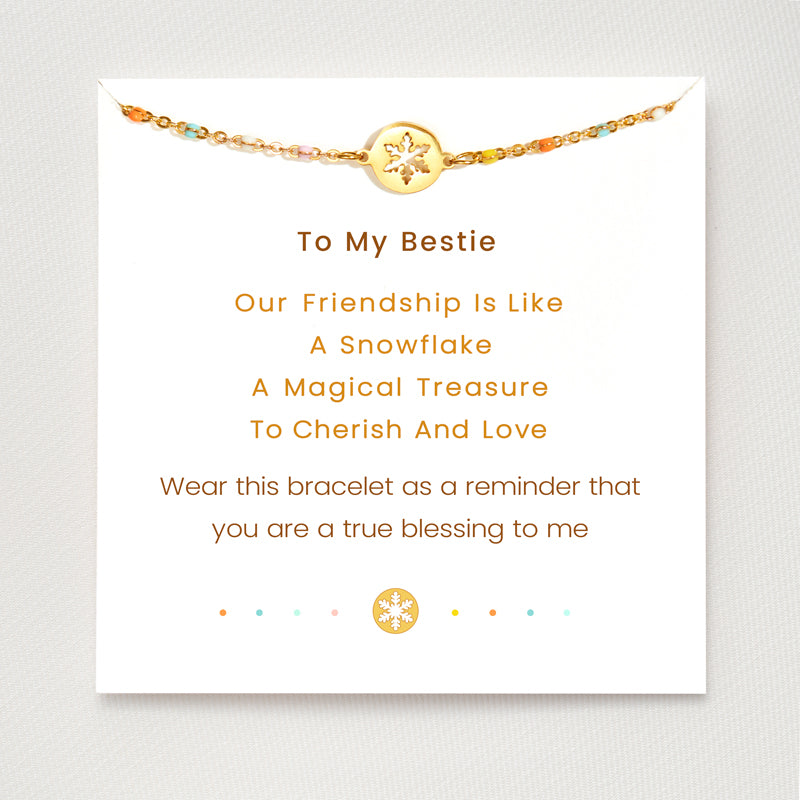 ThisĀ Snowflake Bracelet beautifully symbolizes the pure friendship. With a heartwarming message card included, it is the perfect meaningful gift for Christmas, birthdays, and many more occasions.